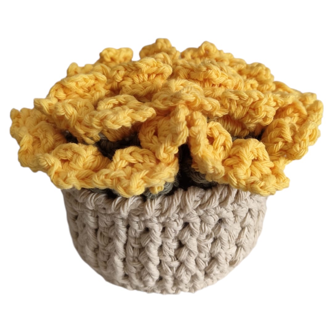 El conjunto incluye 2 posavasos tejidos, presentados dentro de una encantadora maceta tejida, que además de ser práctica funciona como un hermoso elemento decorativo. Su diseño evoca una pequeña flor, aportando color y ternura al espacio.
